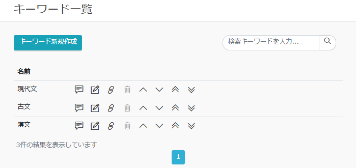 6.44 キーワード一覧 管理者 基本機能 概要 キーワードは、科目に付与する事が出来る検索用データです。 「キーワード一覧」画面には、登録されているキーワードが一覧表示されるとともに、 当該画面からキーワードの新規作成、編集、削除等の操作が行えます。 キーワードは1画面につき25件ずつ表示され、25件を超えるとページ切替となります。 当該機能を利用できるのは、「教材・メディア管理」の権限を持つユーザーのみとなります。 画面項目 名前 キーワード名です。全角/半角問わず30文字まで入力できます。 メニュー 詳細、編集、キーワード一括設定、削除、移動を行うためのボタンが表示されます。 操作 【 キーワード新規作成 】ボタン キーワードを新しく作成します。クリックすると「キーワード作成」画面が表示されます。 検索 検索文字列を入力して【検索】アイコンを押下すると、指定した文字列を含むキーワードが一覧表示されます。 【 詳細 】 キーワードの登録情報を確認できます。クリックすると「キーワード詳細」画面が表示されます。 【 編集 】 キーワードの登録情報を変更できます。クリックすると「キーワード更新」画面が表示されます。 【 削除 】 キーワードを削除します。クリックすると確認ポップアップが表示されます。「はい」をクリックすると削除されます。「いいえ」をクリックすると削除されません。科目に付与されているキーワードは削除できません。 【 キーワード一括設定 】 特定のキーワードを科目にまとめて設定する事や、設定を解除することができます。クリックすると「キーワード一括設定」画面が表示されます。 【 ひとつ前に移動ひとつ後に移動先頭に移動最後に移動 】 キーワードの表示順を変更します。 < 前の項目へ 次の項目へ >
