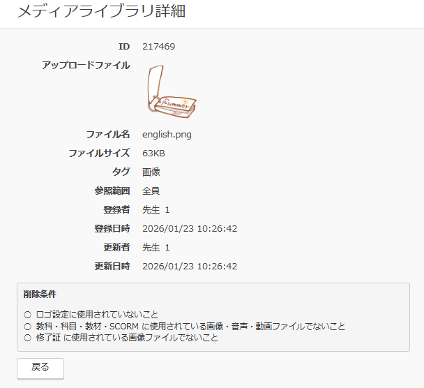 各項目をクリックすることで、メディアが設定されている教科の「教科更新」画面、もしくは科目の「科目更新」画面、もしくは教材の「教材作成」画面(SCORM教材の場合は科目の「科目詳細」画面)に遷移することができます。
