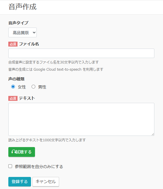 8.5 音声作成 管理者 基本機能 概要 音声作成は、入力されたテキストを音声ファイルに変換する機能です。音声ファイルを作成すると教材のコンテンツとして使用できます。当該機能を利用できるのは、「教材・メディア管理」の権限を持つユーザーのみとなります。 画面項目 音声タイプ 作成される音声ファイルのタイプを選択します。クリックして表示される一覧から音声タイプを選択できます。タイプは「高品質版」「標準版」の2種類から選択可能です。初期表示では「高品質版」が選択されています。 ファイル名[必須] 音声ファイルのファイル名です。 全角/半角問わず、30文字まで入力できます。 声の種類 ファイルを再生する際に流れる音声の種類です。高品質版では「女性」「男性」の2種類、標準版では「普通(女性)」等14種類から選択可能です。初期表示では、高品質版の「女性」が選択されています。 テキスト[必須] 音声に変換するテキストです。高品質版では、全角/半角問わず、1000文字まで入力できます。標準版では、全角/半角問わず、400文字まで入力できます。 操作 【試聴する】ボタン 入力されたテキストを変換して再生する場合にクリックします。 試聴はテキストの最初の100文字まで可能です。 参照範囲を自分のみにする 参照範囲が自分のみと表示されている場合は、メディアをアップロードしたユーザーとサイト管理者権限を保持しているユーザーのみ参照できます。 【登録する】ボタン テキストを音声ファイルに変換して保存する場合にクリックします。 音声ファイルが登録された後、「メディアライブラリ一覧」画面が表示され、 作成した音声ファイルが一覧に追加表示されます。 入力内容に一つでもエラーがある場合はエラーメッセージが表示され、音声ファイルは登録されません。 【キャンセル】ボタン 画面に入力された内容を破棄して「メディアライブラリ一覧」画面に戻ります。 音声ファイルは登録されません。 また、他の画面に移動したりブラウザを終了させた場合、入力中の内容は保存されずクリアされます。 < 前の項目へ 次の項目へ >