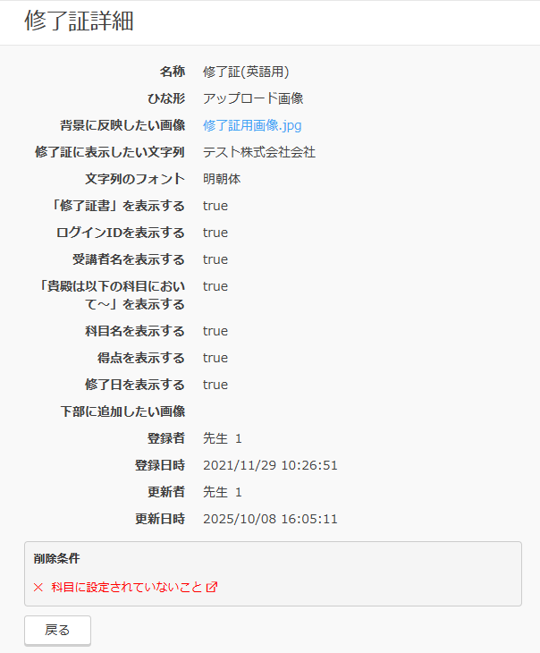 6.35 修了証詳細 管理者 基本機能 概要 修了証が設定された科目では、ステータスが「修了」または「合格」になると、受講者が修了証を出力できるようになります。「修了証詳細」画面では、修了証の登録情報が確認できます。当該機能を利用できるのは、「教材・メディア管理」の権限を持つユーザーのみとなります。 画面項目 名称 修了証の名称です。 ひな形 修了証の背景名です。 背景に反映にしたい画像 修了証に反映したい画像です。設定している場合は、クリックすることで確認ができます(ブラウザによって異なります)。 修了証に表示したい文字列 修了証の最下行に表示される文字列です。 文字列のフォント 修了証に適用するフォントの種類です。 「修了証書」を表示する 修了証に「修了証書」の文字を表示するように指定されていると「true」が表示されます。 ログインIDを表示する 修了証に「ログインID」を表示するように指定されていると「true」が表示されます。 受講者名を表示する 修了証に「受講者名」を表示するように指定されていると「true」が表示されます。 「貴殿は以下の科目において~」を表示する 修了証に「貴殿は以下の科目において所定の課程を修了したことを証します。」の文字を表示するように指定されていると「true」が表示されます。 科目名を表示する 修了証に「科目名」を表示するように指定されていると「true」が表示されます。 得点を表示する 修了証に科目の得点を表示するように指定されていると「true」が表示されます。 修了日を表示する 修了証に科目の修了日を表示するように指定されていると「true」が表示されます。 下部に追加したい画像 修了証の下部に表示される画像です。 登録者 修了証の作成者です。 登録日時 修了証が作成された日時です。 更新者 修了証の更新者です。 更新日時 修了証が更新された日時です。 削除条件 修了証を削除する為に必要な条件が表示されます。 修了証を削除できる場合は、項目の左側に〇が表示されます。 削除できない場合は、項目の左側に×が表示され、文字が赤くなります。また、右側に【利用状況】ボタンが表示されます。 項目が〇になっている修了証は、「修了証一覧」画面で削除をすることができます。 操作 【利用状況】ボタン 削除条件が×になっている場合、削除条件の右側に表示されます。 クリックすると「利用状況」ウインドウが表示されます。ウインドウ内では修了証の利用箇所を確認することができます。 各項目をクリックすることで修了証が設定されている科目の「科目更新」画面に遷移することができます。 項目数が25件を超えると【さらに表示】ボタンが表示されます。 【さらに表示】をクリックすると、25件の利用状況情報が追加表示されます。 全件表示されると、【さらに表示】が表示されなくなります。 教材作成担当グループの設定によっては、利用状況を確認できない項目が存在する場合がございます。その場合は「参照不可」と表示されます。 【 戻る 】ボタン 「修了証一覧」画面に戻ります。 < 前の項目へ 次の項目へ >