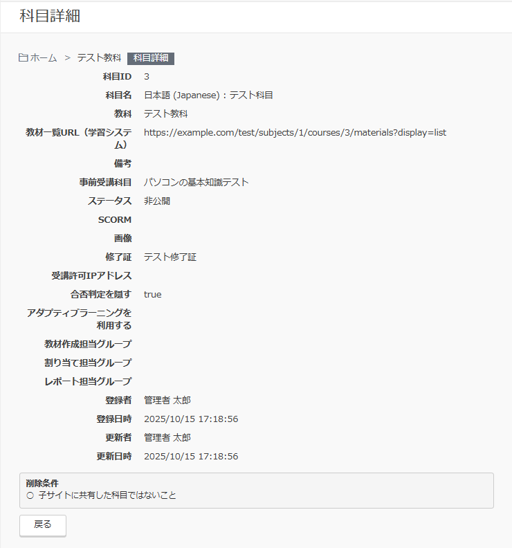 6.14 科目詳細 管理者 基本機能 概要 教材は「教科-科目-教材」で構成され、科目は複数の教材をまとめているものです。 科目は学習者の受講の割当単位となります。 「科目詳細」画面では、科目の登録情報が確認できます。当該機能を利用できるのは、「教材・メディア管理」の権限を持つユーザーのみとなります。 画面項目 科目ID 科目ごとにシステムで自動採番される番号です。 科目名 科目の名称です。 複数言語で科目名を登録した場合、言語ごとの科目名が一覧表示されます。 教科 科目が所属している教科を示します。 教材一覧URL(学習システム) 教材一覧URL(学習システム)をクリップボードにコピーします。受講者がログインしていない状態で教材一覧ページを表示しようとした場合、ログイン処理完了後に直接対象の教材一覧ページが表示されます。割り当てが無い等の理由で学習権限を持たない受講者がこのURLへ遷移した場合、下図のようなエラー画面が表示されます。エラー画面が表示された場合は、マイページ等のアクセス可能なページへ再度遷移してください。 備考 科目の補足情報を示します。 事前受講科目 事前受講科目として設定されている科目名が表示されます。 ステータス 科目の状態を示します。 ステータスには、以下の2種類があります。 公開中 科目が学習者に公開できる状態 非公開 科目が学習者に公開できない状態 SCORM SCORM教材に関する項目です。SCORM教材でない場合は空白で表示されます。 SCORM教材の場合に関しては「科目詳細(SCORM)」をご覧ください。 画像 科目一覧(パネル)で表示される科目の画像です。 クリックすると別タグで表示されます。 修了証 科目に設定されている修了証です。 合否判定を隠す 学習者に合否を表示しない設定の場合は「true」が表示されます。 アダプティブラーニングを利用する アダプティブ科目の場合は「true」が表示されます。 教材作成担当グループ 教材作成担当グループです。「科目担当グループ管理」の権限を持つユーザーのみ表示されます。 割り当て担当グループ 割り当て担当グループです。「科目担当グループ管理」の権限を持つユーザーのみ表示されます。 レポート担当グループ レポート担当グループです。「科目担当グループ管理」の権限を持つユーザーのみ表示されます。 登録者 科目の作成者です。 登録日時 科目が作成された日時です。 更新者 科目の更新者です。 更新日時 科目が更新された日時です。 削除条件 科目を削除する為に必要な条件が表示されます。 科目を削除できる場合は、項目の左側に〇が表示されます。 削除できない場合は、項目の左側に×が表示され、文字が赤くなります。 項目が〇になっている科目は、「科目一覧」画面で削除をすることができます。 子サイトの場合のみ表示されます。 操作 【戻る】ボタン 「科目一覧」画面に戻ります。 < 前の項目へ 次の項目へ >