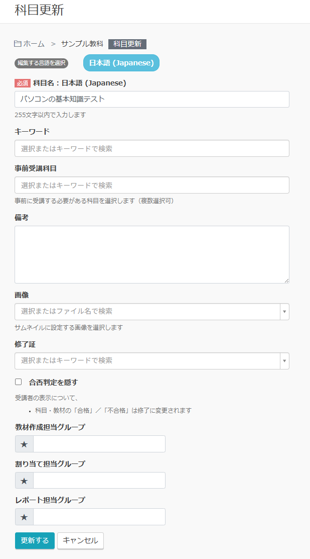 6.10 科目更新(SCORM) 管理者 基本機能 概要 教材は「教科-科目-教材」で構成され、科目は複数の教材をまとめているものです。 科目は学習者の受講の割当単位となります。 当該機能を利用できるのは、「教材・メディア管理」の権限を持つユーザーのみとなります。「教材作成担当グループ」「割り当て担当グループ」「レポート担当グループ」を設定できるのは、「科目担当グループ管理」の権限を持つユーザーのみとなります。「科目更新(SCORM)」画面では、SCORM形式の科目(教材)の登録情報を変更できます。 画面項目 科目名[必須] 科目の名称です。 全角/半角問わず、255文字まで入力できます。科目名のみ変更することが可能です。教材名を変更したい場合はお手数ですが、SCORMの再インポートをお願いいたします。 科目名:日本語以外の言語 本来、「サイト設定」で使用言語を複数設定した場合は、言語毎に科目名を登録できますが、SCORMにつきましては、日本語のみ編集することが可能です。 キーワード 更新する科目に付与するキーワードを指定します。 登録されているキーワードから指定するか、直接入力します。キーワードは一つの科目に100個まで指定できます。 事前受講科目 科目間の依存関係を変更する場合に指定します。事前受講科目が指定されている科目は、事前受講科目を修了しないと受講できません。事前受講科目の件数には制限ありません。 備考 科目の補足情報を変更できます。 全角/半角問わず、200文字まで入力できます。 画像 科目一覧(パネル)で表示される科目(SCORM)の画像です。 クリックすると登録されている画像がプルダウンで一覧表示されます。 画像名または画像名の一部を入力すると、条件を満たした画像のみプルダウン表示されます。 指定した画像の「×」ボタンをクリックすると、画像の指定がクリアされます。 修了証 科目(SCORM)のステータスが「修了」または「合格」の時に表示する修了証です。 クリックすると登録されている修了証がプルダウンで一覧表示されます。 修了証名の一部を入力すると、条件を満たした修了証のみプルダウン表示されます。 指定した修了証の「×」ボタンをクリックすると、修了証の指定がクリアされます。 合否判定を隠す この項目にチェックを付けると、学習者の画面には、ステータスの「合格」/「不合格」が「修了」と表示されるようになります。 また、スコアについても表示されなくなります。学習者に合否を表示させたくない場合にご使用ください。学習者の画面表示のみ変更されます。実際のステータスや得点は、管理者の「レポート」から確認する事が可能です。学習者画面の表示の変更箇所は、以下の通りです。なお、本設定を適用した場合でもSCORM教材自体の挙動は変わりません。科目一覧 科目のステータスの「合格」/「不合格」が「修了」と表示されます。レポート(科目) 科目のステータスの「合格」/「不合格」が「修了」と表示されます。レポート(教材) 教材のステータスの「合格」/「不合格」が「修了」と表示されます。 「正答率」が表示されません。 「詳細」ボタンが表示されません。 教材作成担当グループ 教材作成を担当するグループのグループ名を指定します。クリックして表示される階層表示でグループを指定します。【教材設定担当の表示】を押下することで表示されます。権限に「所属配下ユーザーのみ管理する」が設定されているユーザーの場合、自身の所属するグループ及び配下のグループのみ指定できます。「科目担当グループ管理」の権限を持つユーザーのみ表示されます。 割り当て担当グループ 割り当てを担当するグループのグループ名を指定します。クリックして表示される階層表示でグループを指定します。【教材設定担当の表示】を押下することで表示されます。権限に「所属配下ユーザーのみ管理する」が設定されているユーザーの場合、自身の所属するグループ及び配下のグループのみ指定できます。「科目担当グループ管理」の権限を持つユーザーのみ表示されます。 レポート担当グループ レポートを担当するグループのグループ名を指定します。クリックして表示される階層表示でグループを指定します。【教材設定担当の表示】を押下することで表示されます。権限に「所属配下ユーザーのみ管理する」が設定されているユーザーの場合、自身の所属するグループ及び配下のグループのみ指定できます。「科目担当グループ管理」の権限を持つユーザーのみ表示されます。 操作 事前受講科目 クリックすると登録されている科目のうち事前受講科目として設定可能な科目がすべて表示されます。 自分自身および自分自身が事前受講科目として設定されている科目は事前受講科目として指定できません。 キーワードを入力すると、指定したキーワードを含む科目が表示されます。 該当科目が共有設定されている場合に選択できる科目は、同様に共有設定がされており、共有先のサイトが