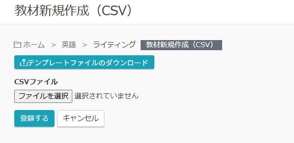 CSV形式のファイルを取り込むことによって、教材を新規登録する事が出来ます。