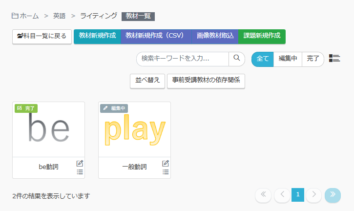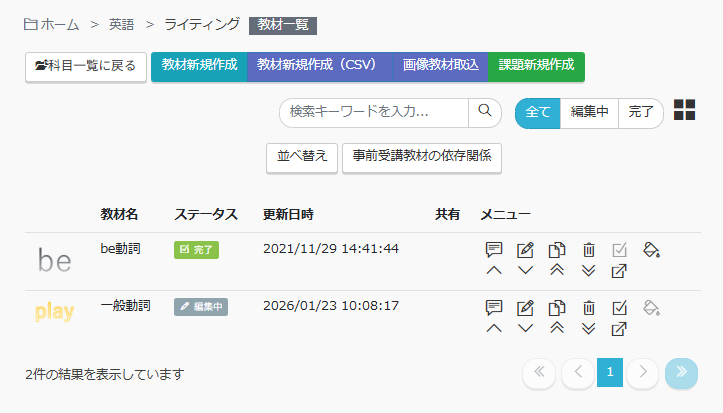 6.19 教材一覧 管理者 基本機能 概要 教材は「教科-科目-教材」で構成され、教材は最下位カテゴリ(受講単位)です。「教材一覧」画面には、登録されている教材が一覧表示されるとともに、教材の新規登録、編集、削除等の操作も行えます。教材は1画面につき25件ずつ表示され、25件を超えるとページ切替となります。また、25件以上のユーザーが登録されている場合は、一度に表示する件数を50件または100件に変更することができます。当該機能を利用できるのは、「教材・メディア管理」の権限を持つユーザーのみとなります。 画面項目 グリッド表示 教材名 教材の名称です。 教材名が長い場合、教材名の最初の数文字のみ表示されますが、 教材をポイントすると吹き出しで全文を確認できます。 ステータス 教材の左上に表示されるアイコンで教材の状態を示します。ステータスによりアイコンも変化します。ステータスには以下の2種類があります。編集中教材の作成が完了していない状態完了教材の作成が完了した状態教材を学習者に受講させるためにはステータスを完了にする必要があります。ただし、教材のステータスが完了になっただけでは受講はできません。※ 受講のためには以下の3つの条件を満たす必要があります。教材が完了状態であること(独自教材)科目のステータスが公開中であること割り当て設定がされていて、かつ割り当て期間内であること 共有 教材の左上に表示されるアイコンで教材の共有状態を示します。共有アイコンには以下の2種類があります。共有:教材を子サイトに共有している状態、又は親サイトから共有されている状態アイコンなし:教材を子サイトに共有していない、親サイトから共有されていない状態 【編集】ボタン クリックすると教材の編集画面が表示されます。 【メニュー】ボタン 詳細、複製、削除、ステータス[編集/完了]の変更、教材の移動を行なうためのボタンが表示されます。 リスト表示 教材名 教材の名称です。 ステータス 科目の左上に表示されるアイコンで教材の状態を示します。ステータスによりアイコンも変化します。 ステータスには以下の2種類があります。 編集中教材の作成が完了していない状態 完了教材の作成が完了した状態 教材を学習者に受講させるためにはステータスを完了にする必要があります。 ただし、教材のステータスが完了になっただけでは受講はできません。受講のためには以下の3つの条件を満たす必要があります。 教材が完了状態であること(独自教材) 教材のステータスが公開中であること 割り当て設定されかつ割り当て期間内であること 更新日時 教材が更新された日時を示します。 共有 教材の共有状態を示します。教材を子サイトに共有している場合、又は親サイトから共有されている場合は 共有 が表示されます。 メニューボタン 詳細、編集、複製、削除、ステータス[編集/完了]の変更、教材の移動を行なうためのボタンが表示されます。 操作 【リスト表示】ボタン 教材の一覧表示方法リスト表示に変更します。 【グリッド表示】ボタン 教材一覧の表示方法をグリッド表示に変更します。 【教材新規作成】ボタン 教材を新しく作成します。クリックすると「教材作成」画面が表示されます。ただし、親サイトと子サイトで共有している教科内では、子サイトでは表示されません。 【教材新規作成(CSV)】ボタン CSVファイルを取り込んで、教材を新しく作成します。クリックすると「教材新規作成(CSV)」画面が表示されます。 ただし、親サイトと子サイトで共有している教科内では、子サイトでは表示されません。 【画像教材取込】ボタン 画像を取り込んで、教材を新しく作成します。クリックすると「画像教材取込」画面が表示されます。ただし、親サイトと子サイトで共有している教科内では、子サイトでは表示されません。 【課題新規作成】ボタン 課題を新しく作成します。クリックすると「課題作成」画面が表示されます。ただし、親サイトと子サイトで共有している教科内では、子サイトでは表示されません。 教材選択(グリッド表示時)/行選択(リスト表示時) 教材の登録情報を確認します。 各教材をクリックすると「教材編集」画面が表示されます。 ただし、親サイトと子サイトで共有している教科内では、 子サイトで各教材をクリックしても「教材編集」画面は表示されません。 【メニュー・詳細/詳細】 教材の登録情報を確認できます。 クリックすると「教材詳細」画面が表示されます。 【編集】 教材の内容を変更します。 クリックすると「教材編集」画面が表示されます。 【メニュー・複製/複製】 教材を複製します。 クリックすると確認ポップアップが表示されます。「はい」をクリックすると複製された教材の「教材編集」画面が表示されます。「いいえ」をクリックすると複製されません。教材名の上限が255文字となっているため、上限を超える場合はTIMESTAMPが途中で切れてしまうためご注意くださ