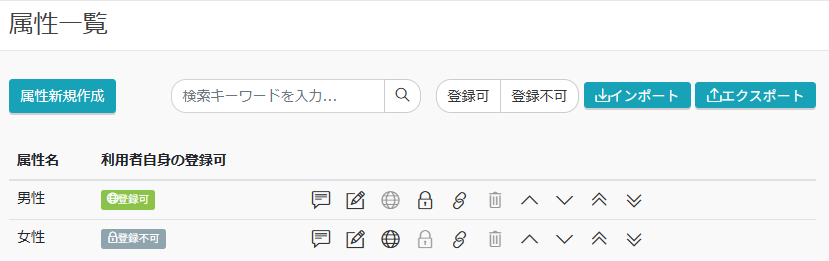 4.12 属性一覧 管理者 基本機能 概要 属性はユーザーを任意の単位でグルーピングする機能です。 属性によってユーザーをグループではない別の単位でグルーピングすることができ、まとめて受講設定を行うことや、受講状況を参照することができます。「属性一覧」画面では、登録されている属性が一覧表示されるとともに、属性の新規作成、変更、削除等の操作も行えます。 属性は1画面につき25件毎に表示され、25件を超えるとページ切替となります。当該機能を利用できるのは、「属性管理」の権限を持つユーザーのみとなります。 画面項目 属性名 登録されている属性の名称です。 利用者自身の登録可 利用者自身によるユーザー登録時、利用者自身で属性を選択できるようにします。「利用者自身の登録可」に設定した属性は、登録可と表示されます。そうでない属性は登録不可と表示されます。「サイト設定」にて「利用者自身によるグループ・属性登録設定可」が選択されている場合に限り表示されます。 操作 【 属性新規作成 】ボタン 属性を新しく作成します。クリックすると「属性作成」画面が表示されます。 【 詳細 】ボタン 属性の登録情報を確認します。 クリックすると「属性詳細」画面が表示されます。 【 編集 】ボタン 属性の登録情報を変更します。 クリックすると「属性更新」画面が表示されます。 【 利用者自身の登録可 】ボタン 利用者自身によるユーザー登録時、利用者自身で属性を選択できるようにします。 クリックすると 登録可 が表示されます。「サイト設定」にて「利用者自身によるグループ・属性登録設定可」が選択されている場合に限り表示されます。 【 利用者自身の登録不可 】ボタン 利用者自身によるユーザー登録時、利用者自身で属性を選択できないようにします。クリックすると 登録不可 が表示されます。「サイト設定」にて「利用者自身によるグループ・属性登録設定可」が選択されている場合に限り表示されます。 【 属性一括設定 】ボタン 特定の属性をユーザーにまとめて設定することや、設定を解除することができます。 クリックすると「属性一括設定」画面が表示されます。 【 削除 】ボタン 属性を削除します。 クリックすると確認ポップアップが表示され、「はい」をクリックすると削除されます。 属性がユーザーに設定されている場合は、その属性を削除できません。 一度削除した属性は、元に戻すことができませんので、注意して行なってください。 【ひとつ前に移動/ひとつ後に移動/先頭に移動/最後に移動】ボタン 属性の表示順を変更します。 行選択 属性の登録情報を編集する場合にクリックします。クリックすると「属性更新」画面が表示されます。 【 インポート 】ボタン CSVファイルを取り込みことで属性を作成・更新します。 クリックすると「属性インポート」画面が表示されます。 インポートに必要な項目は以下の通りです。エクスポートされたCSVファイルを基にインポートを行うと確実です。 属性名[必須] 登録する属性の名称です。全角/半角問わず、30文字まで入力できます。 利用者自身の登録可 利用者自身がユーザー登録する際に、利用者自身で登録できる属性を指定します。利用者自身で登録できるようにしたい属性には「TRUE」と記入します。そうでない属性には、何も記入しません。 「サイト設定」にて「利用者自身によるグループ・属性登録設定可」が選択されている場合に限り必要な項目です。 備考 属性に関する補足の情報です。全角/半角問わず、200文字まで入力できます。 登録日時 ※ 内容の指定は不要です 更新日時 ※ 内容の指定は不要です 【 エクスポート 】ボタン 登録されている属性情報をCSVファイルに出力します。 クリックすると保存先を指定するダイアログボックスが表示されます(ブラウザにより異なります)。 検索によって絞り込みされている場合は表示されている属性のみ出力され、絞り込みされていない場合は全ての属性が出力されます。 エクスポートされる項目は以下の通りです。 属性名 備考 利用者自身の登録可「利用者自身の登録可」は、「サイト設定」にて「利用者自身によるグループ・属性登録設定可」が選択されている場合に限り表示されます。 登録日時 更新日時 絞り込み(ステータス) 【登録可 登録不可】ボタンをクリックすると、以下のステータスの属性を絞り込むことができます。 登録可 属性が「利用者自身の登録可」に設定された状態 登録不可 属性が「利用者自身の登録可」に設定されていない状態 検索 検索キーワードを入力して【検索】アイコンを押下すると、 指定したキーワードに完全にまたは部分的に一致する属性が一覧表示されます。 検索対象の項目は以下の通りです。 属性名(部分一致) < 前の項目へ 次の項目へ >